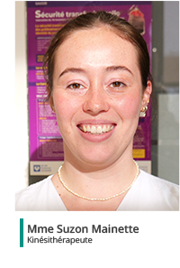 Nous disposons dans le service d’une kinésithérapeute, Madame Suzon Mainette (présente une demi-journée dans le service du lundi au vendredi) dont le rôle est la prise en charge soins des patients hospitalisés.